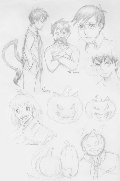 An assortment of sketches including my first Shiemi! And, some fall/Halloween-themed pumpkins. After seeing my SWAT Kat pumpkins, Rin had to get in on the act.
