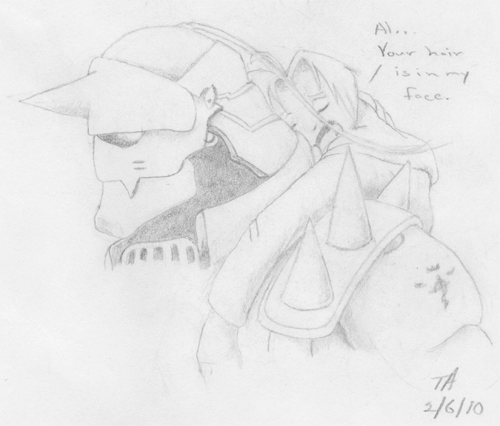 Naptime Another little FMA sketch. A very boring one that's reminiscent of one of the still shots from the third opening to the first anime. But, it helped to get me sketching again and let me practice Al. Al's spikes are hard. (pencil sketch) |