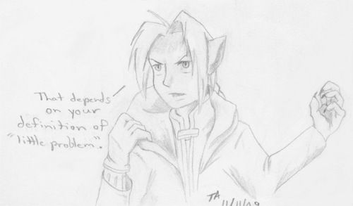 Disclaimer: Fullmetal Alchemist belongs to Hiromu Arakawa, Square ENIX, Studio BONES and various other parties. All other characters and material within this page are the property of either myself, Kristen Sharpe/T.L. Amos, or their respective creators. |