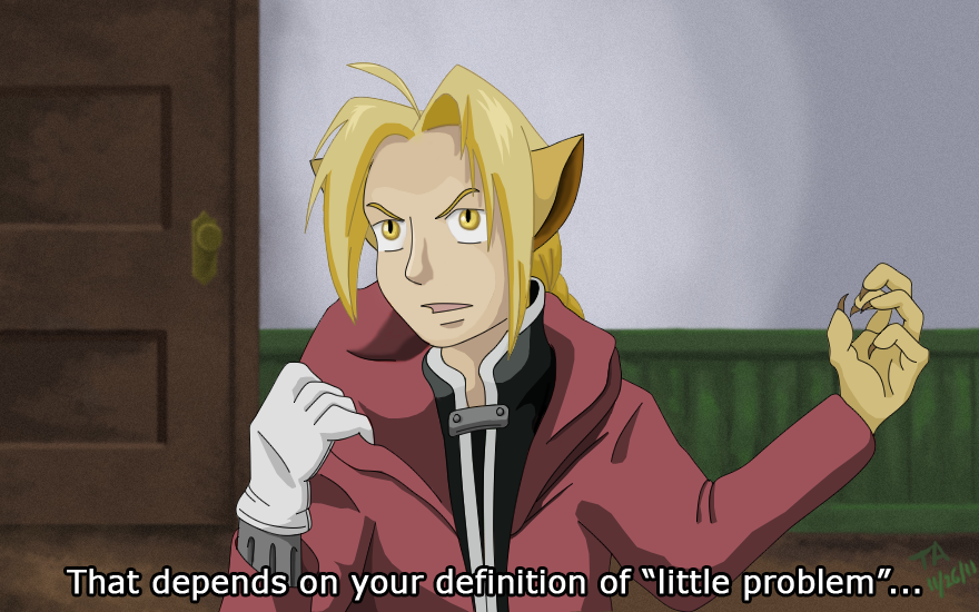 A Little Problem Ed is experiencing a bit of a problem. But, I'm sure he'll find a solution ;) This is an old drawing that I finally colored. I used it to test out that fake screenshot look. Here's hoping it came out half-decently! Here's the original sketch if you're interested. And, courtesy the awesome RandomCheeses, there is a fanfic to accompany this, using the dialogue from some jokes we had going on deviantART plus a lot of fleshing out and added hilarity from her that I had nothing to do with. (Image is displaying smaller than actual size. Click for full size.) (Photoshop CS5) |