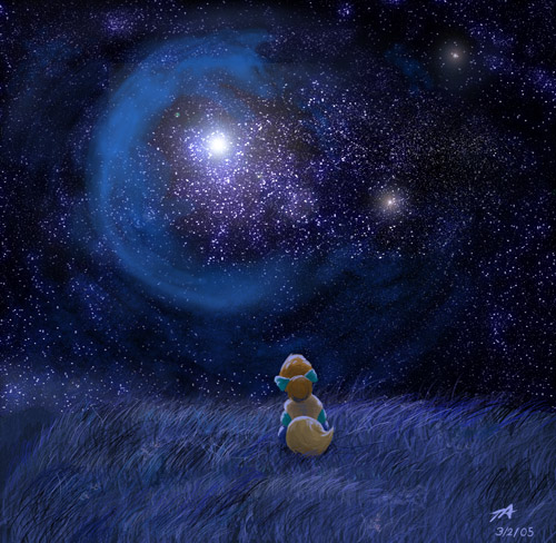 ![]() Shippou looks at the night sky, thinking of his father. This actually started as practice for making starfields, following the tutorial by Greg Martin. Then, it grew into this. This is my first posted image created entirely in the computer, Shippou sketch and everything. |
