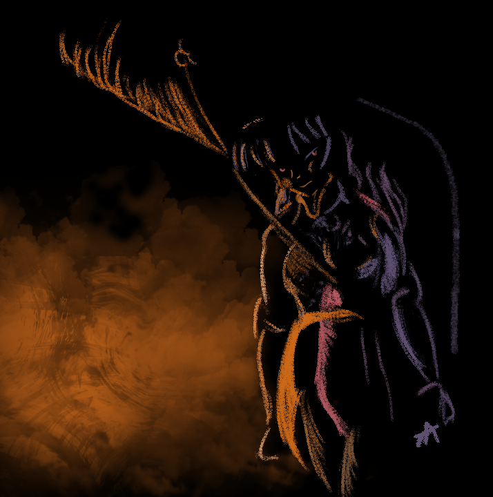 ![]() This is an old, old sketch I recently dragged out and cleaned up. I have no idea how Sango left a youkai on fire behind her, but it made for fun lighting. (Painter and Photoshop CS6.) |