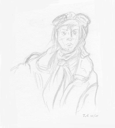 Amelia Earhart? - Not exactly. Our model for Commercial Figure Drawing dressed up in an Amelia Earhart-esque get-up on another student's request. I thought it was interesting, so I did this sketch of her... without the face. I added the face on a whim, so it looks nothing like the model. But, I thought it was cute.(pencil drawing)