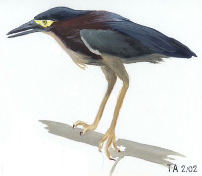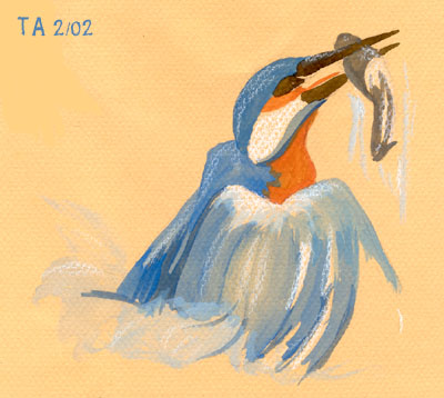 Fishing - A fishing bird done later and in a slightly different style as the teacher kept urging us to use the technique for quick sketches. (goauche and white pencil)