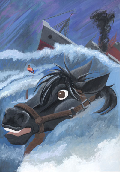The Black Stallion - My first finished assignment for my Intermediate Illustration class. The actual size is much larger than my scanner's bed, so this was scanned in 8 pieces and reassembled in Photoshop. Anyways, as the title says, it's a cover concept for Walter Farley's novel "The Black Stallion." I do love some of the covers I've seen over the years. But, they all just picture The Black... and, while I simply love some of those images, I wanted to try to capture the idea that the book is part adventure story. At any rate, I like The Black, but I think the background needs work yet. Aiy... Always happens with older images. "The Black Stallion" and associated characters copyright to Walter Farley. (goauche painting)