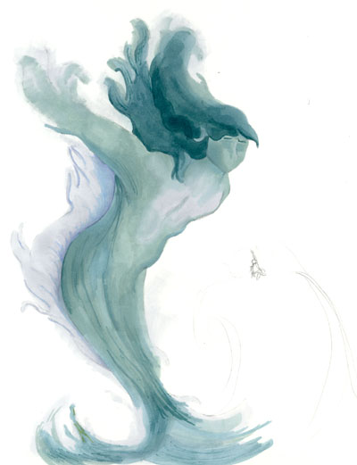 This is an older image that I may redo someday. The figures need work, and a lot of detail in the spirit's face was lost while painting. Any suggestions are welcome.(goauche painting)