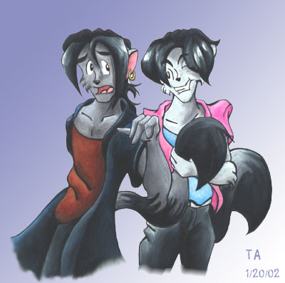 Heya! *tug* Whatcha Doin'? - Done for Jessica Ratte, it's Mitch Logan and his sister Dakota. Heh, I know if my brother had a tail it would be how I always got his attention.... and how I annoyed him... and how I stopped him when he started off somewhere without listening to me... and.... Mitch and Dakota Logan are copyright to Jessica Ratte. (Prismacolor pencils)