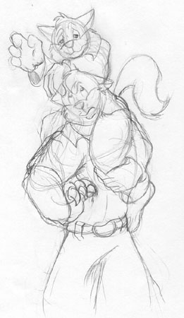Jake gets comfortable on Chance's shoulders. Hmm... Might not be the best idea. Chance looks like he's tired of lugging him around. Played around with the background on this one, trying to imitate the show's background style. Parts of it I like, parts I don't. Definitely need some more practice with this. You can view the original sketch here. (Prismacolor markers and Photoshop)