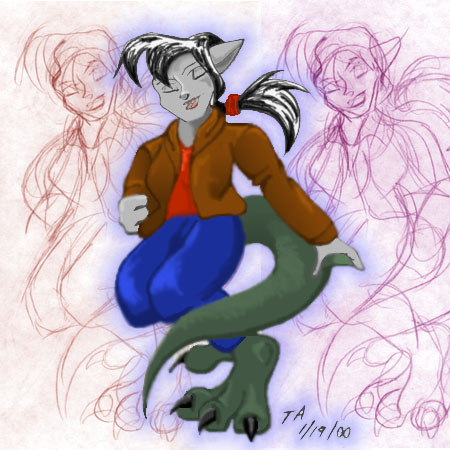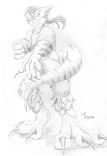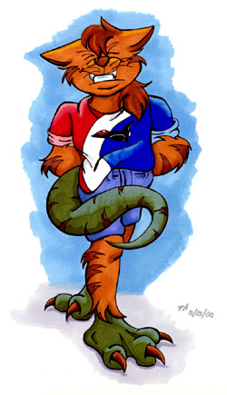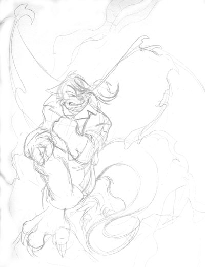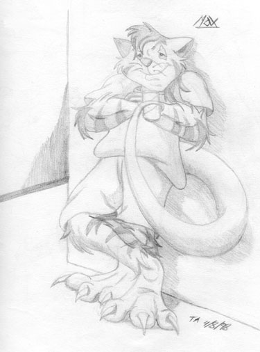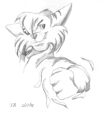 One Casual Kat - Max again. This one's a little more accurate. No, you can't see his wings - they're "reabsorbed" at the moment. He can grow and reabsorb them at will - they form from a slimelike substance that oozes from his back. (pencil drawing)
