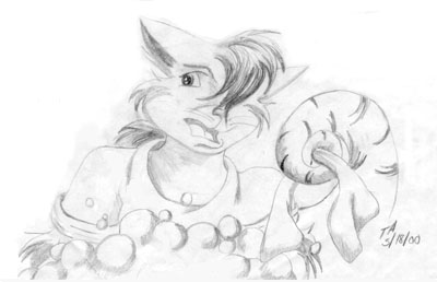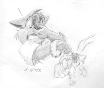 Ryan, Get Your Tail Over Here and Help Me!!! - Max got stuck washing the dishes. But, no way is he drying them! Yes, he's holding the towel with his tail ;) Drawn in a style related to my old "Cat-Like" pics of Chance and Jake. (pencil drawing)