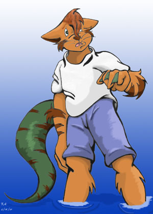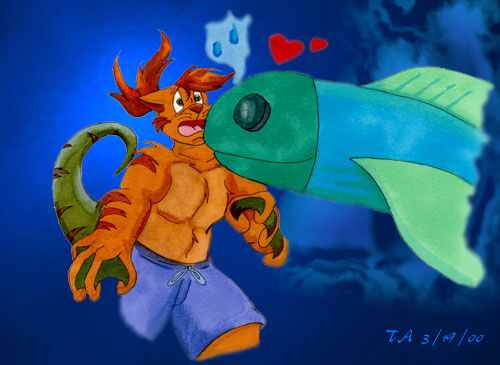 Pucker Up! - Drawn purely for me to test my new set of Tria markers (they were used on the fish). Out for a leisurely swim, Max encounters an admirer, but she's not exactly his species. Okay, she's not even close. He's a kat/frog/lizard hybrid; she's a fish. It'll never work out. (Prismacolor and Tria markers with computer background)