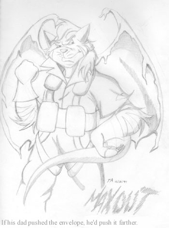 Maxout - A character from my future-oriented fanfics, a SWAT Kat from the future, Maxout. No, he's not another gargoyle - he's a mutant kat (he needed a little redesigning when I drew this though - the resemblance is too close for my tastes). His wings are a little too small in the pic (for reasons of fitting them on the page), but he can change their size when he wants to anyway. (pencil drawing)