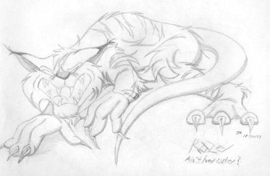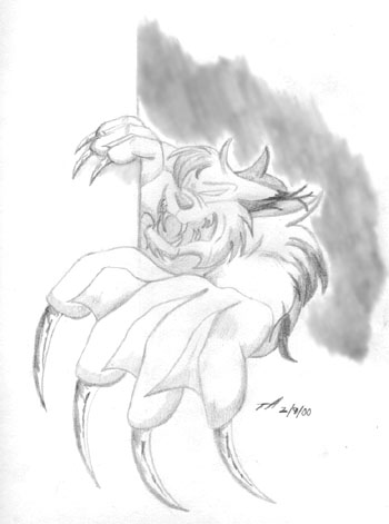 Hello There.... - Somebody's about to be introduced to Max's fist, and it's not gonna feel good. I did a little work on Max's design - added stripes to his tail, and played with the area on his legs where it switches from fur to that nice lumpy green skin. Oh, and his claws aren't normally that long.... just when he's ready for a fight! At any rate, it's not a design I've kept. (pencil drawing)