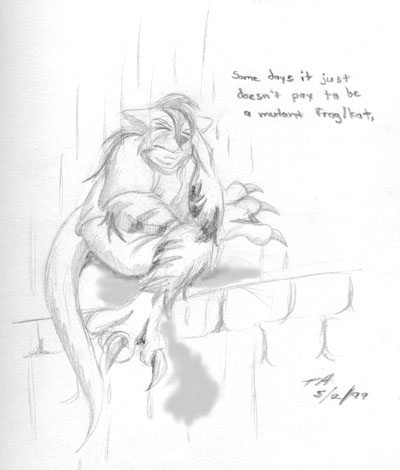Alone With His Misery - A quick sketch of Max out in the rain alone, contemplating how much life stinks when you're a mutant frog/kat. His feet look less like frog webs and more like talons in this pic unfortunately.... (pencil drawing)