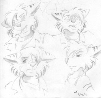 The Creation of a New Character - A page of sketches as I developed my latest character. The final designs are the bottom two. And, with them, Sypher is born. Mind you, the expression on the left is an unusual display of emotion from Sy. (pencil drawing)