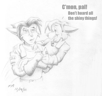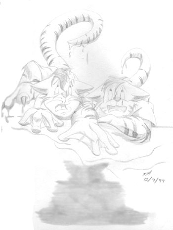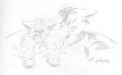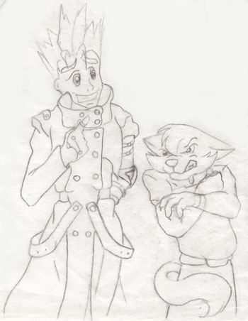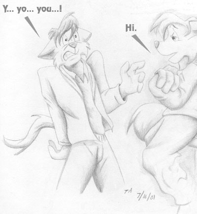 Shiiiiiny! - The CyberKat Shrapnel once again demonstrates that downloading feline instincts wasn't the best idea for him... as he accosts fellow MegaKat Bureau of Investigation agent Burst after seeing the glint off his watch. (pencil drawing)