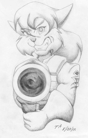 I Said FREEZE! - Enforcer Captain Jessie Clawson packing a seriously large gun and looking ticked. 'Ware Jessie. She's never without her arsenal. (mechanical pencil drawing)