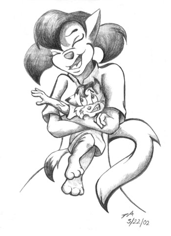 I'll Love You and Hug You and Call You Trixie! - A birthday present for Rebecca Mason. Her character Manga has finally caught that cutie Matrix. Only he's not his usual handsome fella kinda cute. But, as usual, he's not much on hugging! (mechanical pencil drawing)