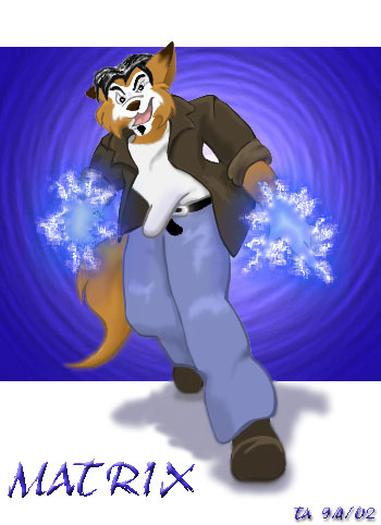 One Shnazzy CyberKat - My (belated) birthday pic for Sage. It's Matrix bein' his cool, sparky self. I've actually been toying with this image for a while, so it's the result of a couple different coloring experiments coming together. All "pre-Wacom". At least it finally came out decent. Well, Sage liked it at any rate! (Photoshop over a pencil drawing)