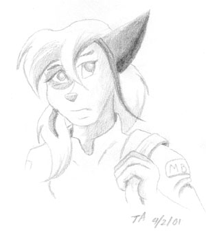 Sandy - MBI agent Sandy Clawdwin. Her specialty is a crossbow, but, lacking a reference, I only drew the strap to it in this pic. (pencil drawing)