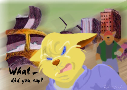 "WHAT... Did you Say?" - In CyberKat plot the SWAT Kats end up with the ability to change from matter to energy at will. It's just... keeping it at bay when you get mad... and would really like to fling an energy blast at someone, which is what Chance wants to do very badly. Hence the glowing eyes. I am very pleased with my background here. The drawn part is three years old... Methinks it salvaged nicely. (Pencil drawing colored in Photoshop on a composite Prismacolor marker/charcoal pencil/Photoshop background)