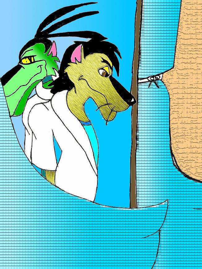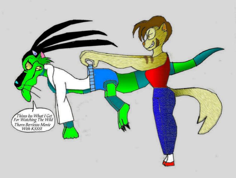 | wedgiedance.jpg | KS has just seen The Wild Thornberries Movie and she is dong The Wedgie Dance with Viper. He is not enjoying it either. >:) |